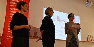 Das miteinander Teilen, ein zentrales Anliegen der Ausstellung und der Leitbegriff von Cornelia Sollfrank, spiegelt sich auch in der Gestaltung der Räume wider. Ein Bereich ist mit Tischen, Stühlen und Sitzbänken ausgestattet und wird für gemeinsames Arbeiten und Meetings verwendet, ein anderer Bereich mit einem Teppich und Bodenkissen dient der Entspannung. Dort werden Videos von drei Begegnungen mit internationalen Kuratorinnen gezeigt. Magda Tyźlik-Carver (England), Ela Kagel (Deutschland) und Ruth Catlow (England) sprechen mit Sollfrank über ihre Erfahrungen bei der Leitung von Kulturinstitutionen. commons lab ist ein experimentelles Umfeld, eine funktionale Struktur – und steht damit ganz im Gegensatz zur Idee des Kunstraumes als funktionale Struktur. Der Raum ist als modulares, beliebig erweiterbares System konzipiert, offen für Improvisationen, was Diskussionen, Dialoge und Prozess erleichtert, alles Dinge, die gegenwärtig passieren. Es ist nicht mehr nur der/die Künstler/in oder Autor/in allein, der/die bestimmt; der Raum dient gemeinsamen Projekten. Entsprechend ist es ein hybrider Raum, eine Mischung aus Forschungslabor und Hackerspace, bestens geeignet für ein Charrette-Verfahren.