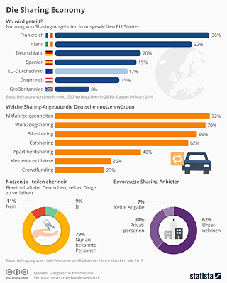 Einer Studie von PwC zufolge nutzt 2018 schon jeder dritte Mensch in Deutschland Sharing-Angebote, Tendenz steigend. Mehr als zwei Drittel davon teilen Mitfahrgelegenheiten, Werkzeuge oder Fahrräder. Auch Carsharing, Kleidertauschbörsen und das private Vermieten von ungenütztem Wohnraum sind im Trend. Daten der EU und der Verbraucherzentrale zufolge liegt Deutschland damit im europaweiten Vergleich deutlich über dem Durchschnitt.