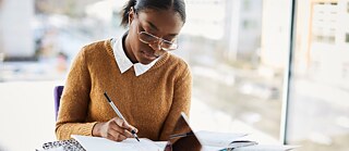 Eine junge Frau lernt konzentriert, vor ihr liegen viele Arbeitsmaterialien. Im Hintergrund ist eine moderne Stadtansicht unscharf zu sehen.