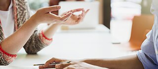 Nahaufnahme von Händen zweier Studierender. Vor ihnen liegen aufgeschlagene Bücher.