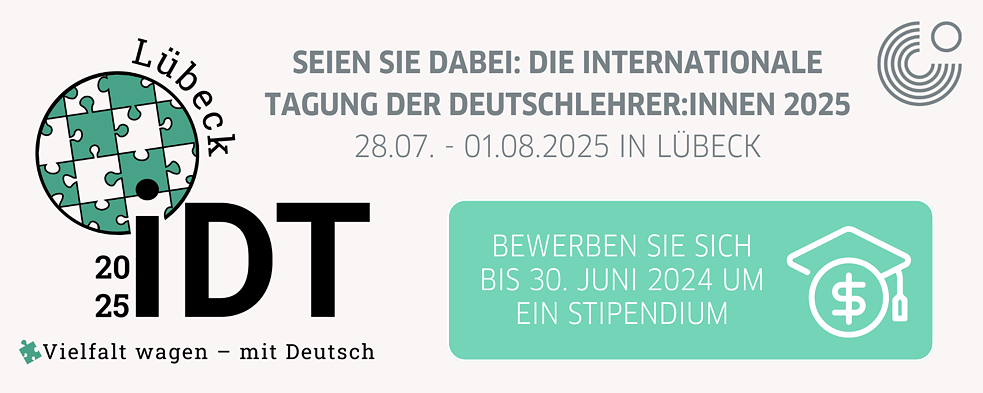 Wenn Sie möchten, können Sie sich voraussichtlich bereits bis zum 01.09.2024 für den Frühbucherrabatt auf der Webseite der IDT 2025 an. Eine spätere Anmeldung ist möglich, resultiert aber u. U. in höheren Gebühren. Für Stipendiat*innen des Goethe-Instituts wird hierfür ein spezieller Link zur Verfügung gestellt.