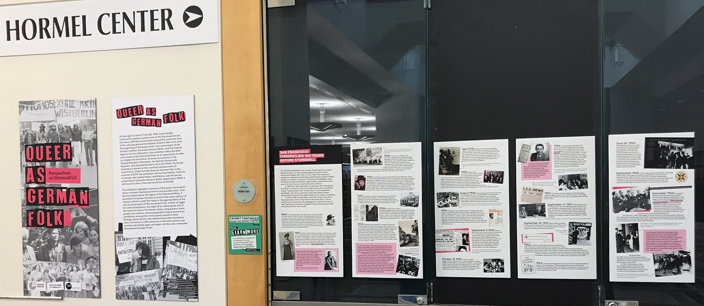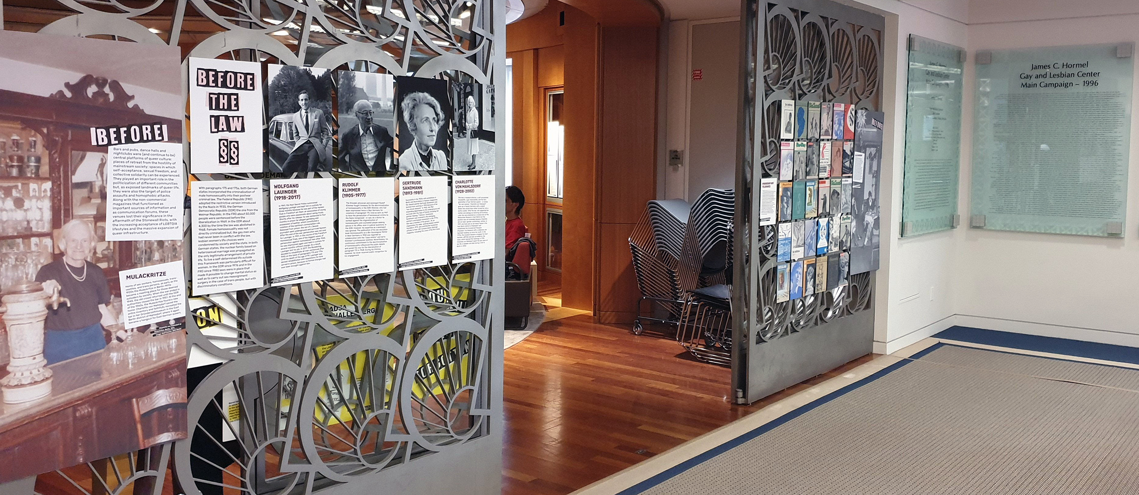 The James C. Hormel LGBTIQ+ Center on the third floor of the Main Library in San Francisco is a library, a meeting place, and a venue for exhibitions and events. This lively place of exchange and discussion about gender diversity is where the main part of the exhibition Queer as German Folk is on view. A small portion of the exhibition is at the Eureka Valley/Harvey Milk Memorial Branch Library. Located in a LGBTIQ neighborhood, the latter segment of the exhibition primarily serves to promote its main part at the Hormel Center.