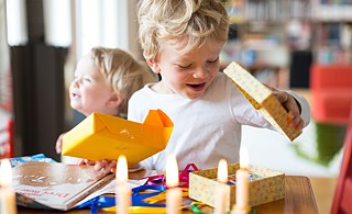 Six boys and girls from Jonas’ kindergarten have arrived. Once everyone is gathered in the living room decked out in festive streamers and balloons, the first thing Jonas wants to do is unwrap his presents. A traditional game will decide who has the honour of handing their gift to the birthday boy first. The children sit in a circle around a bottle around on the floor. The bottle is spun, and whoever it is pointing to when it stops is the first to go. The first gift is opened, and the spinning continues until every child has had a turn to give Jonas their gift.