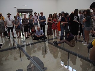 “Anne Imhof is an artist who looks at society, the individual and the body with such a contemporary as well as clear realism,” as Susanne Pfeffer explains her choice. She has been observing the artist’s work from its beginnings. Faust is the title of this long-term scenario of five hours’ length. The title alludes of course to German cultural heritage and Wolfgang von Goethe, but it is quite literally about the clenched fist. It is about power, powerlessness, violence, resistance and in the end about their counterpart: freedom, since each and every individual’s freedom of thought is central to Imhof’s pieces.Imhof occupies the German pavilion, this fascistic building from the 1930’s, with her work. The grounds were fenced in, four Dobermans guard the front section. The performers have taken their positions on the façade, on the fences. The built-in walls, consoles and the additional level are made of glass, they engender new interrelationships in this space. This is familiar from institutional buildings or banks, where transparency is stage-managed and power demonstratively shown.