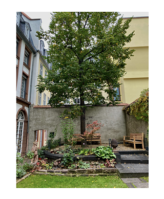 Here, of a sudden, there is a calmness and a tree and two benches and symmetrical walls and an almost zen atmosphere; the sun breaks through the Frankfurt clouds, and I sit.