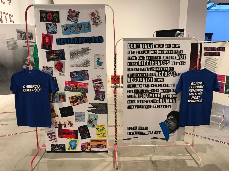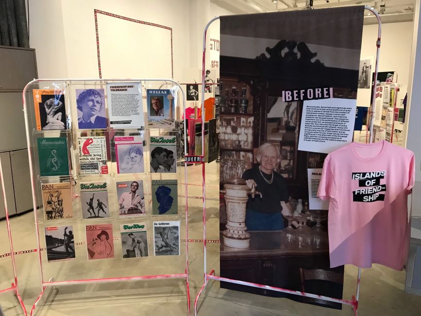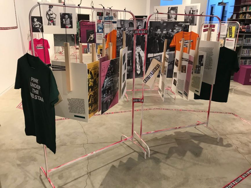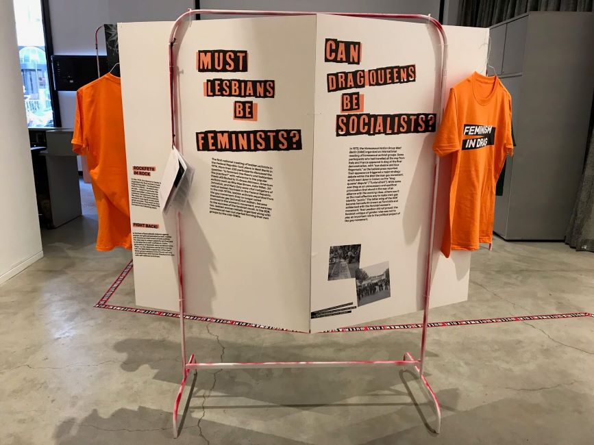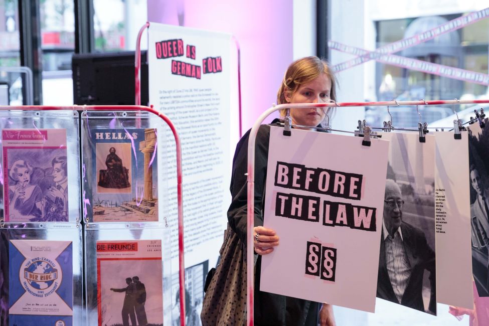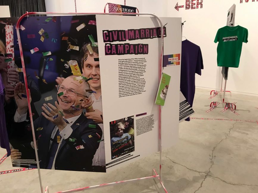 Visitors can take main and side paths along the historical continuum of the exhibition. Adhesive tape imprinted with the exhibition title serves as an innovative leitmotif on the floor and on the walls. The look back at the history of the queer movement ends with an outlook: the Manifestos for a Queer Future and the Stonewall snaps. While visitors may take the manifestos home to read, the snap wall, reminiscent of a street barricade, invites them to contribute their own Stonewall moments to the exhibition.