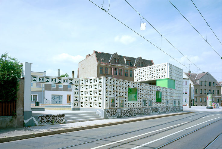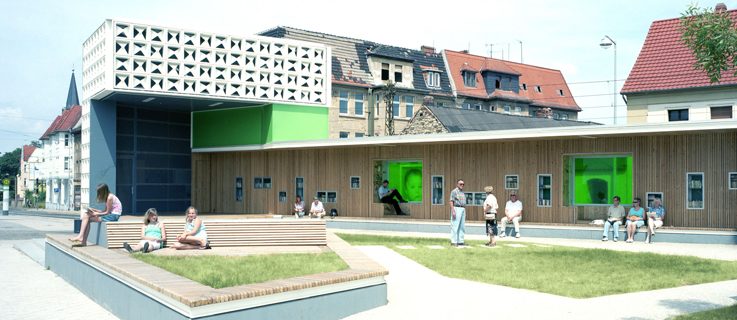 L’architecture éphémère offre de nombreuses possibilités de participation. Les édifices sont construits de façon plus simple que des bâtiments durables et peuvent être plus facilement transformés. Et même le non professionnel peut acquérir les méthodes de construction et participer aux décisions. Prenons l’exemple du “Signet Salbke” du bureau d’architectes Karo : dans un quartier en déclin de Magdebourg, Salbke, les urbanistes ont, avec la collaboration des riverains, aménagé sur le terrain laissé en friche de l’ancienne bibliothèque une bibliothèque temporaire à ciel ouvert faite à partir de casiers à bouteilles. Le succès a été tel que l’on a décidé d’y ériger une bibliothèque permanente à ciel ouvert.