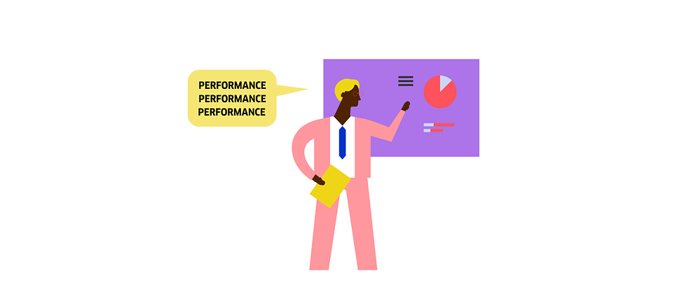 Illustration:  Une personne montrant un tableau avec plusieurs diagrammes ; bulle de texte avec le contenu : « Performance, performance, performance »