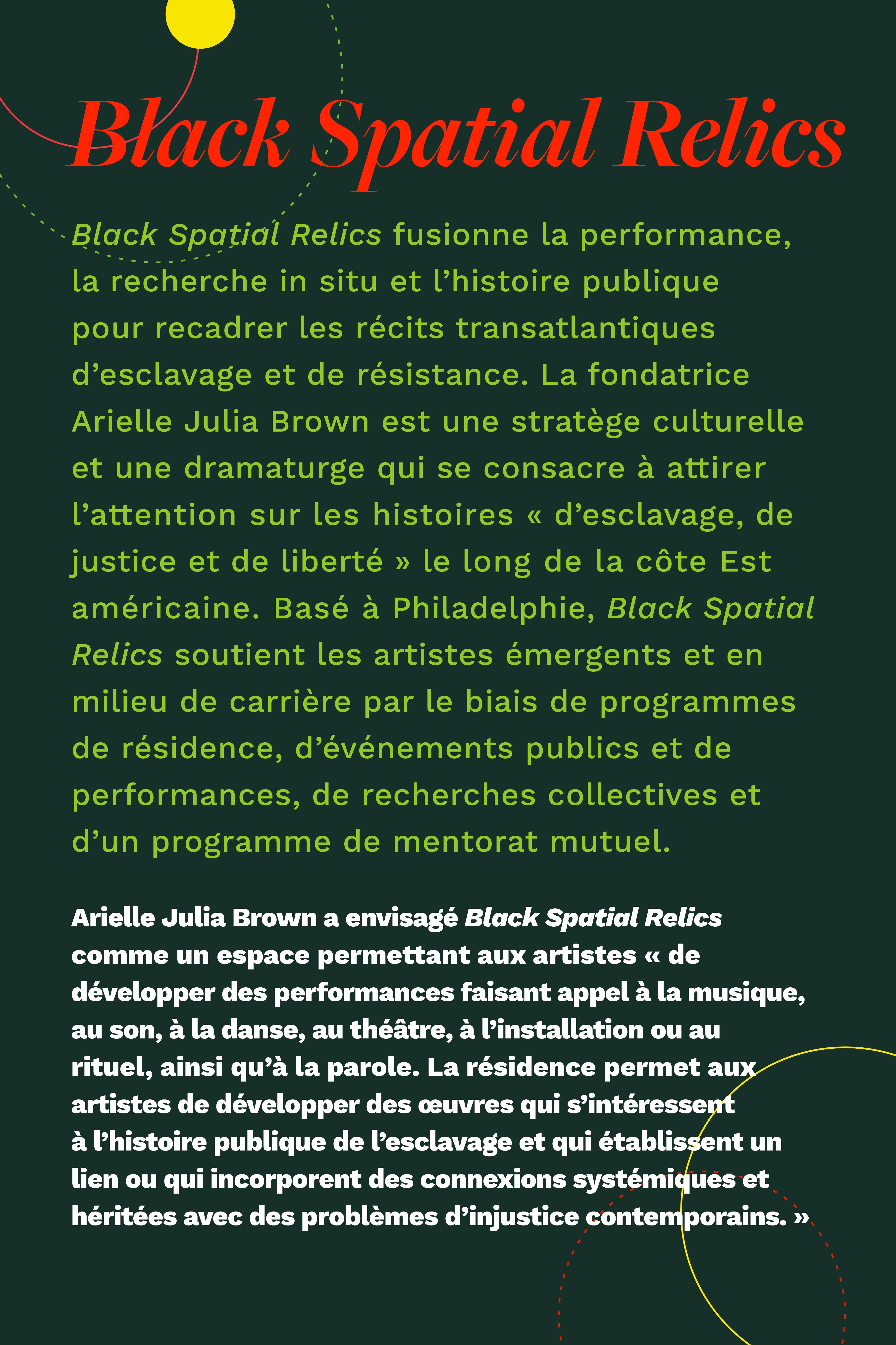 Black Spatial Relics fusionne la performance, la recherche in situ et l’histoire publique pour recadrer les récits transatlantiques d’esclavage et de résistance. La fondatrice Arielle Julia Brown est une stratège culturelle et une dramaturge qui se consacre à attirer l’attention sur les histoires « d’esclavage, de justice et de liberté » le long de la côte Est américaine. Basé à Philadelphie, Black Spatial Relics soutient les artistes émergents et en milieu de carrière par le biais de programmes de résidence, d’événements publics et de performances, de recherches collectives et d’un programme de mentorat mutuel.