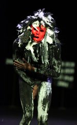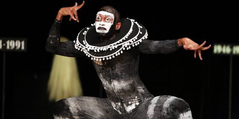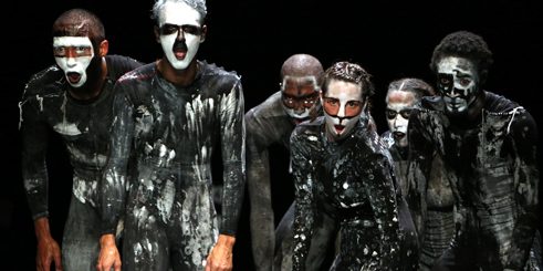 Most impressive is the transformation that her six extraordinary performers undergo, deeply shifting in tone and resonance as they move from one dance to the next. Wearing black and white “dance of death” costumes, masks, and makeup, by French designer Vava Dudu, Boglárka Börcsök, João Martins, Yvon Nana-Kouala, Luis Rodriguez, Corey Scott-Gilbert and Sara Tan exhibit heightened degrees of rhythmic and physical strength, and ably display the energetic investment necessary to engage in combat and war, whether in victory or mourning.