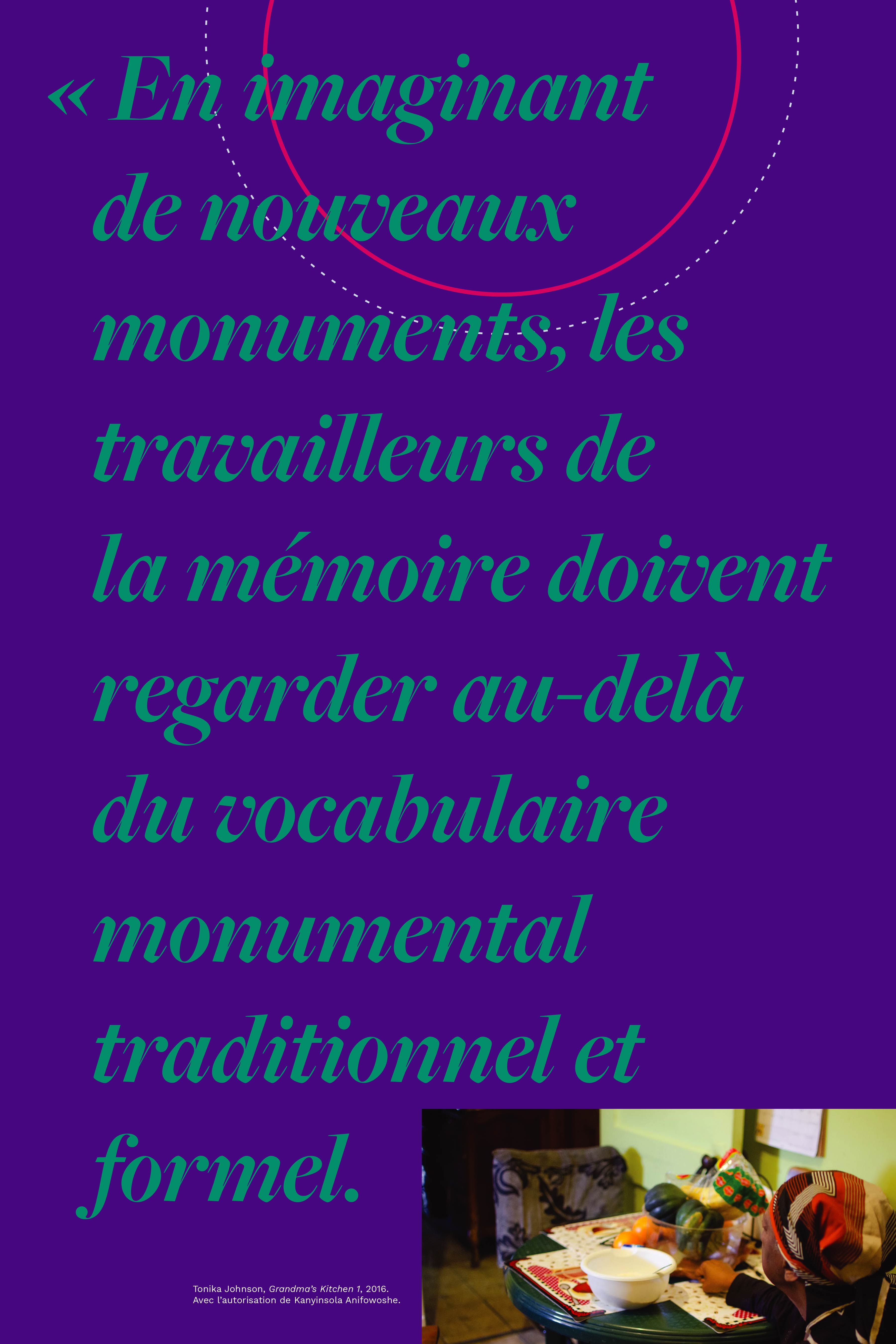 In Search of Our Mothers' Gardens rend hommage aux pratiques artistiques intergénérationnelles et historiquement marginalisées des femmes noires. Inspirée par l’essai classique d’Alice Walker du même nom, Kanyinsola Anifowoshe canalise la narration intergénérationnelle et la monumentalité critique comme moyen de subsistance et de résistance. En tant qu’étudiante au secondaire en 2019, elle a organisé des programmes, des ateliers et une exposition avec des artistes de Chicago afin de centrer les pratiques créatives des femmes et des filles noires et d’envisager de nouveaux monuments à la mémoire de leurs aïeules.