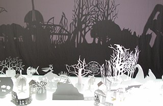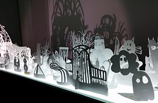 Le duo d’artistes montréalaises Mere Phantoms, formé de Maya Ersan et Jaimie Robson, s’inspire des traditions du théâtre d’ombres, des débuts du cinéma et des papiers découpés. Elles réalisent des performances et des installations participatives qui se situent entre le spectacle et l’expérience. Habituées de confectionner des constructions tridimensionnelles architecturales, elles ont trouvé un point d’intersection pour le Goethe-Institut en adoptant la tradition artistique allemande du papier découpé, le Scherenschnitt, qui préconise des petites scènes rurales et villageoises. L’histoire de l’art allemande compte de nombreux artistes qui pratiquent cet art, dont l’artiste Adèle Schopenhauer (1797-1849), soeur du philosophe Arthur Schopenhauer. L’idée de développer une installation autour du concept du jardin public allemand s’est greffée par elle-même. L’architecture, étant une forme et un thème omniprésents dans leur pratique, le sujet de jardin, quant à lui, adresse de la nouveauté chez elles. Lors d’un entretien avec le duo, elles me partageaient le défi de travailler avec une matière bidimensionnelle- le papier découpé - afin de produire un résultat tridimensionnel - l’ombre portée. « Le médium final est toujours l’ombre et le papier est une manière d’obtenir ce résultat. Dans la pratique traditionnelle le papier est la forme artistique », m’expliquait Maya Ersan. Sur des surfaces basses, elles ont agencé une composition de maquettes de papier qui juxtapose une végétation sauvage et dense avec une organisation de l’espace public (petites maisons, château, etc.), orientées vers l’aspect décoratif et la silhouette.