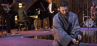 As the audience enters the theatre, the performers are hanging out upstage in what resembles both a music studio and a living room of sorts, with music instruments on one side of the space, a purple drape suspended from the ceiling, a diamond-shaped floor space, surrounded by expanses of purple floor covering, and on the other side, a couch and a stack of paintings.