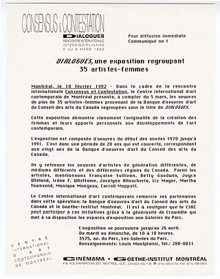Grand événement multidimensionnel, Consensus & contestation : dialogues invite des membres de communautés universitaires et artistiques à collaborer à la création d’un lieu d'échanges regroupant femmes artistes et théoriciennes. Ateliers, expositions et performances, ce forum interdisciplinaire « souhaite promouvoir », écrit Dieta Sixt, « l’échange des idées entre les artistes et les théoriciennes et jeter ainsi les bases d'une collaboration et d’une réflexion novatrices. » Spectacle inédit présenté en collaboration avec l’organisme Tangente, la performance multimédia Reaching Beyond de l’allemande Ilka Doubek est le résultat de la collaboration d’artistes allemands, canadiens et québécois. La réalisatrice Jutta Brückner présente quant à elle son film Un amour colossal.