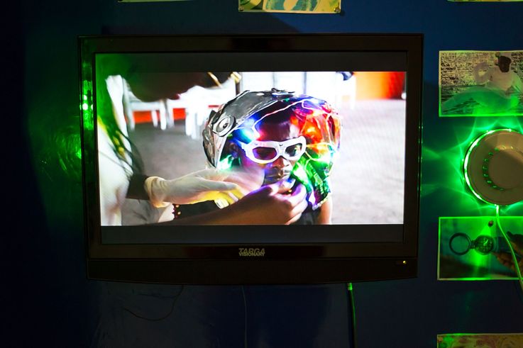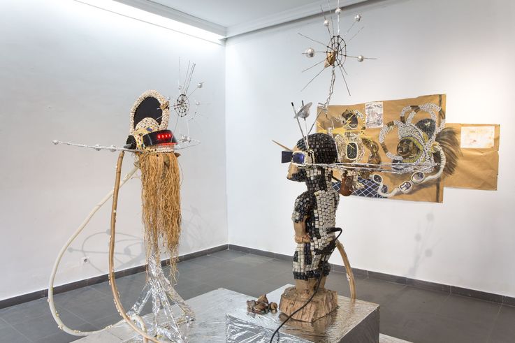 Kinshasa est une ville cosmopolite, culturelle, économique et politique. Sur le plan historique, elle est formée de toutes les ethnies Congo. Ce travail est un réappropriation de l’imaginaire kongo, l’imaginer avec l’imaginaire électronique et tenter de le proposer dans un concept futuriste. En même temps, ce projet loue cet héritage biologique et spirituel, artistique et scientifique, laissé par ses anciens. « CYBER_NKISI ou NGANGANAUT » est un croisement, un mixage et en même temps une cohabitation entre deux univers, l’un tiré de la culture kongo et l’autre tiré de la culture numérique, qui se mêlent pour naviguer dans un nouveau concept, hybridant entre la spiritualité et la technologie. Le projet propose une vision technologique bien plus avancée que celle actuelle, en s’appuyant sur la mythologie africaine et plus précisément sur la vie des sociétés traditionnelles du royaume kongo. Mythologie racontant la sorcellerie, la divination, la télécommunication, le mode de déplacement qui se faisaient aux travers des objets magico-spirituels tels que la statuette nkisi ou fétiche à clou, le cauris, lokole ou Poso Ya nguba. Des objets à clou qui jadis étaient utilisés comme un objet de commande à distance et de contrôle, ayant les mêmes fonctions qu’ont un clavier d’ordinateur ou une télécommande aujourd’hui.
