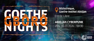 Komm am 6. März 2026 um 18:30 Uhr ins Goethe-Institut zu einer neuen Ausgabe der Goethe Gbôrô Nights unter dem Motto „Abidjan Cyberpunk“.