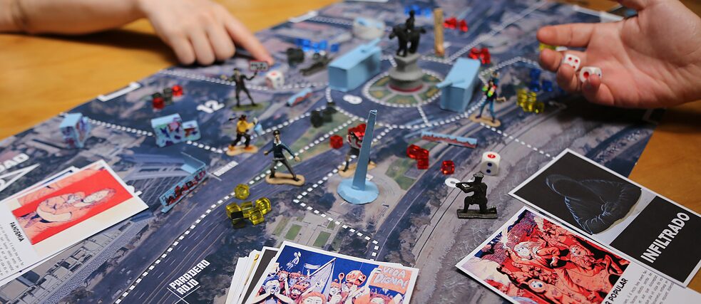 PLAZA DIGNIDAD ist ein Brettspiel, das die „Zona 0“ (sprich der Teil von Santiago in dem sich hauptsächlich die sozialen Proteste und Zusammenstöße zwischen Polizei und Protestierenden zutragen) als Grundlage nimmt. Die Spieler*innen nehmen hierbei die Rollen der verschiedenen Protagonist*innen ein, die Teil dieses historischen Ereignisses sind. Sie müssen zum einen den ständigen Angriffen der Polizei (ausgelöst durch die Willkür des Würfels) entkommen und sich gleichzeitig so organisieren, dass die notwendigen Versammlungen und -jetzt schon als episch wahrgenommenen- Protestaktionen stattfinden können (diese sind als Spielsteine über das Spielbrett verteilt). Wie diese Aktionen verlaufen wird von den schicksalslenkenden Spielkarten entschieden, die die politischen Ereignisse dieser beispiellosen Protestbewegung festhalten und das Spiel in jeder Runde aufs Neue verändern.