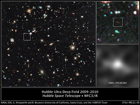 Imagen tomada en 2003 por el Hubble Space Telescope, en la que aparecen más de 10 mil galaxias, entre ellas las más distantes en el universo. © NASA, ESA, G. Illingworth (University of California, Santa Cruz), R. Bouwens (University of California, Santa Cruz, y Leiden University) y el equipo HUDF09.