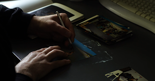 Familienfotos. Das Gesicht einer Frau wird zerkratzt oder übermalt. Dazu fragmentarische Schilderungen plötzlicher Gewaltausbrüche der Mutter. Annäherung an das Trauma einer Gewalterfahrung.