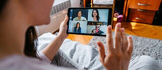 Eine junge Frau im Schneidersitz blickt auf ein viergeteiltes Bild auf einem Tablet.