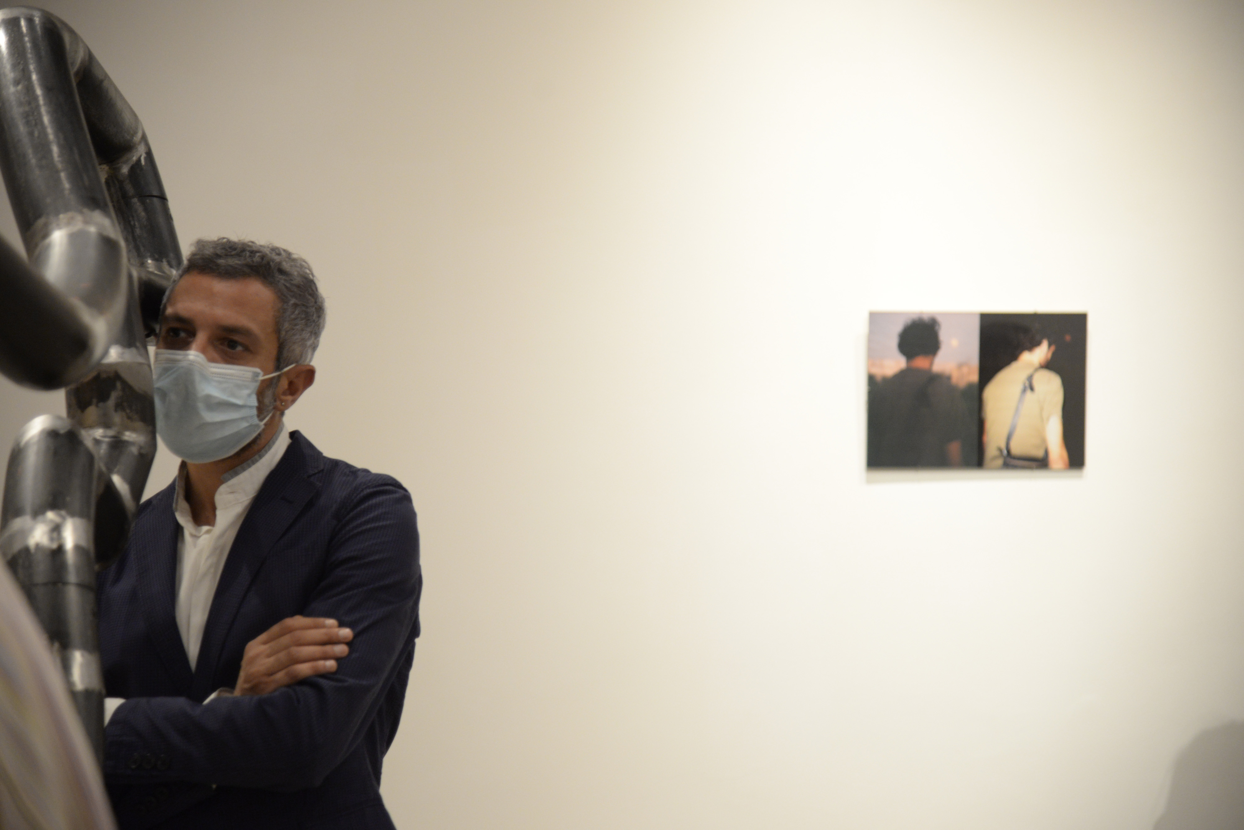 Küratör Marina Christodoulidou salondaki sergiye bakıyor.
