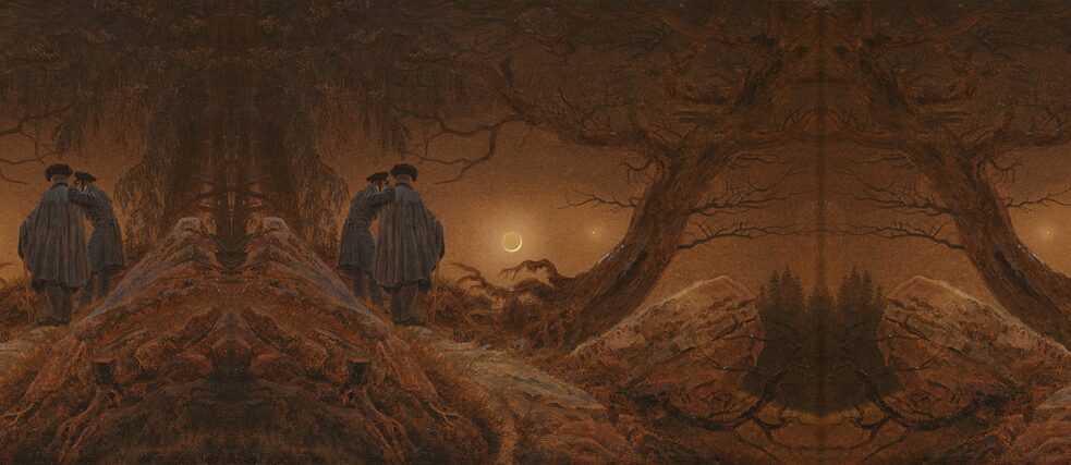 Výstava blíže představuje jedno ze stěžejních děl ze sbírek Staatliche Kunstsammlunge Dresden. Tím je olej na plátně z roku 1918 až 1920, Dva muži pozorujíci měsíc. „Friedrich na něm zachytil měsíc jako ústřední motiv romantiků. Kolem něj soustředil další obrazné elementy, jako je holý strom coby symbol smrti, jehož suché větve se natahují k věčně zelenému smrku, příslibu věčného života a vykoupení. Oba muži, kteří přihlížejí této noční scenérii, jsou oděni do takzvaného staroněmeckého kroje, jimiž se demokraticky smýšlejíci studenti během osvobozeneckých válek vymezovali vůči vládnoucímu režimu“, vysvětluje Birkholz.Náboženská a politická ikonografie se stejně jako u Friedricha objevuje i u ruských malířů, jako je například Alexej Venecianov. Jeden ze zakladatelů venkovského žánrů v ruském umění zachycuje na svých plátnech prostřednictvím náboženských ideálů, jakými jsou Marie s Ježíškem nebo Jan Křtitel, idealizovaný život nevolníků, čímž je zároveň adoruje. O tom svědčí mj. vystavená mistrovská olejomalba Při žni s venkovankou, která na pozadí obilných lánů kojí svoje dítě.