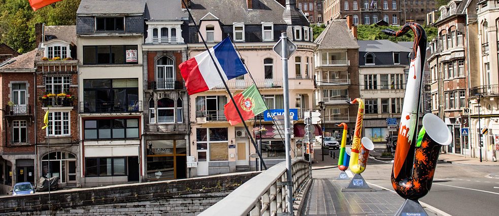 Umělecký projekt o saxofonu na mostě přes řeku Mázu (Meuse) ve městě Dinant; v popředí „Rumunsko“ | Foto (výřez): Fernand Letist
