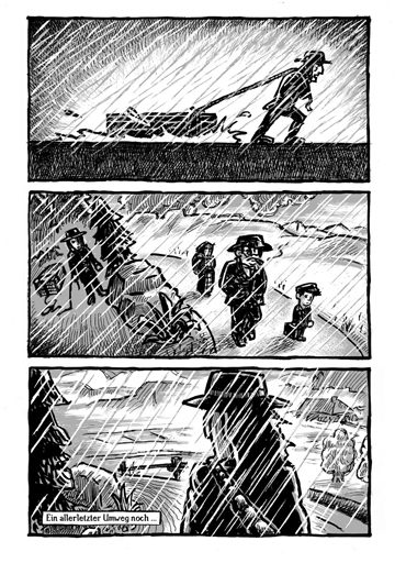 Golem im Emmental (Golem v Emmentalu). Příběh z alpské vesnice o moci, zneužívání a protestu vypráví o bývalém židovském vojákovi Jakobu Mendelovi, který za sebou jako kdysi Django táhne rakev. Jen místo kulometu převáží legendárního Golema – s podobně katastrofálními následky jako v italské westernové předloze. Kresby svými výraznými kontrasty připomínají dřevoryty Franse Masereela a komiksu tak dodávají mimořádnou intenzitu.