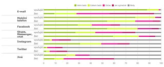 V tom se značně liší od svých žáků (28 procent). Ve srovnání se studenty nejsou také vyučující tolik zvyklí komunikovat prostřednictvím sociálních sítí a chatovacích platforem (Skype, Messenger, …).