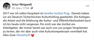 Chodili jste k nám na kurzy němčiny, nebo stále chodíte? Patříte návštěvníkům naší knihovny? Jaké kulturní akce vám utkvěly ve vzpomínkách? Budeme rádi i za Vaše vzpomínky na to, co jste v Goethe-Institutu zažili. Napište nám: info-prag@goethe.de.