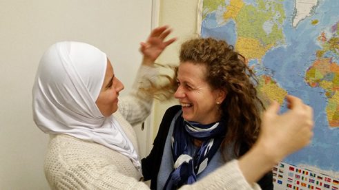 Im Frauenraum im dritten Stock, in dem Bewohnerinnen und freiwillige Helferinnen unter sich sind, herrscht am Nachmittag Hochstimmung. Geflüchtete aus Syrien, Afghanistan, Irak und anderen Ländern haben gerade ihren Deutschkurs beendet. Während die Männer Behördengänge machen, um eine Aufenthaltserlaubnis oder Asyl in Deutschland zu beantragen, tanzen die Frauen ausgelassen auf dem Teppich, schwingen die Hüften wie beim Bauchtanz. Da stößt eine Frau eine Folge schriller hoher Trillertöne aus – ein Ausdruck höchster Freude.