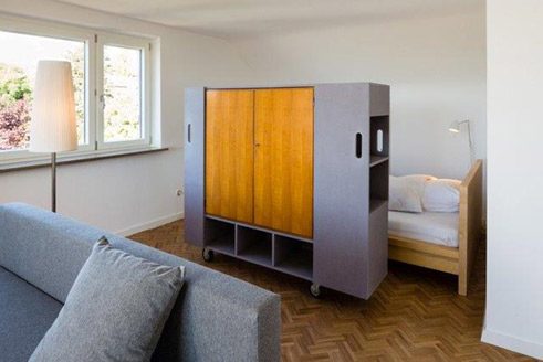 Die reale DDR-Wirtschaft aber entkernte Horns Idee. Die Möbelhändler stellten das System als ganzheitliche Schrankwand aus und verkauften es so. In den 1970er-Jahren erhielten die Werkstätten Hellerau dann die staatliche Anweisung, nur noch vormontierte Möbel zu fertigen. Auch in der Bundesrepublik setzte man die serielle Produktion mit standardisierten, vorgefertigten Formen gleich, sodass sich hier ebenfalls Komplettschränke etablierten. Unversehens wurde das Mobiliar zum vollflächigen Einbau. In den USA, so erklärt Axel Müller-Schöll, ist die Schrankwand fester Bestandteil einer Wohnung, der bleibt, auch wenn die Mieter wechseln. Wer sich hingegen in Deutschland eine Schrankwand zulegt, kann diese bei einem Ortswechsel meist nicht zurücklassen – „und umziehen wollen Sie damit nicht! Der Aufbau von IKEA PAX für meine Tochter hat mich zwei Tage gekostet,“ ergänzt Müller-Schöll. Zwar ist das wandfüllende PAX-Schranksystem gegenwärtig überaus erfolgreich, doch schwingt im Gleichklang der Silben des Wortes „Schrankwand“ heute neben Normierung und Spießbürgertum noch immer Sesshaftigkeit mit.Einen praktischen Vorschlag machte Axel Müller-Schöll, als er das ehemalige Haus seiner Mutter zu einem Verbund von Lofts für temporäre Gäste umbaute. Er entfernte von einigen alten Einbauschränken die Sockel, umhüllte die Schränke neu mit Mitteldichten Holzfaserplatten (MDF) und stellte sie anschließend auf Rollen. Sie sollten die individuelle Abtrennung des Raumes, aber auch das Ankommen an einem Übergangsort ermöglichen. Müller-Schöll gestaltete sie als Inventar eines Lebensraums, “an dem man keine Wurzeln schlagen will, der kein Zuhause ist, an dem man sich aber doch gewissermaßen daheim fühlen kann.“