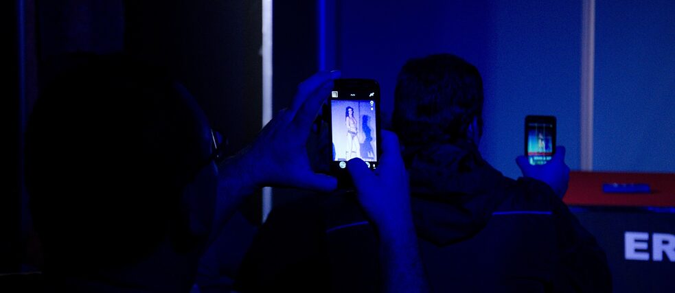 Schnell war es mir klar: Familienväter vom Land, die heimlich kamen um die exotischen „Tänzerinnen“ zu sehen. Eine Party für Kameraden mittleren Alters, die nach dem zweiten Bier ihren zweiten Frühling entdeckten. Panische Studentlein, die zu wenig Selbstbewusstsein hatten, um ein Mädchen zum Rendezvous einzuladen, aber entschlussfreudig genug waren unter dem Deckmäntelchen der Nacht vom Internet loszukommen. Nicht einmal auf meine Favoriten musste ich verzichten: wollüstige Opas mit Kamera. Vor allem einer verdiente meine Aufmerksamkeit; so ein etwas finsterer Typ (nennen wir ihn einmal Gerhard), der sich bis dicht ans Podium vorgedrängelt hatte und unverhohlen jedes Detail dessen aufnahm, was sich dort gerade abspielte. Als vernünftiger Paparazzo habe ich zur Abwechslung ihn fotografiert.Aus meiner teilnehmenden Beobachtung riss mich irgendein Mitdreißiger im Tiroler, vor dessen Stand ich unbewusst stehen geblieben war: „Aber junge Frau“, sagte der Typ, „Sie sollten besser vor der Kamera stehen als dahinter.“ Als ich den Schreck und die Information verdaut hatte, wurde mir klar, dass der Herr versuchte mir erotische Fotos anzubieten, also meine eigenen. Ich lehnte stammelnd ab und spürte, wie mir das Blut erneut ins Gesicht schoss. Ich nahm lieber die Beine in die Hand und ging zur Sicherheit bis ganz ans Podium vor, in der Hoffnung, dass es im Auge des Tornados windstill sein würde.