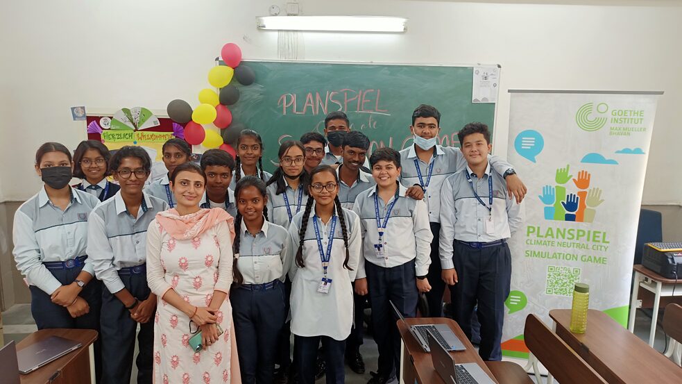 15 Schüler*innen der 9. und 10. Klasse (Niveaustufe Deutsch A1) und die Lehrerin Radhika Vashisht nehmen am Planspiel teil.