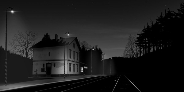 Kalte Einsamkeit haucht den Betrachter an. Ein kleiner, heruntergekommener Bahnhof im Dunkel der anbrechenden Herbstnacht. Flackernde Laternen werfen einen matten Schein auf den bröckelnden Bau und Gleise, die ins Nichts führen. Vom kühlen Wind bewegt, ragen spitzzackige Tannen in das Bild. Der Maler Edvard Hopper hätte die Tristesse aus Licht und Schatten nicht besser einfangen können. An diesem Ort, Bílý potok im unwirtlichen Altvatergebirge (Jeseníky), lebt und arbeitet der Fahrdienstleiter Alois Nebel. Und wenn den Mittfünfziger die Angst beschleicht, dann greift er zum Fahrplan und liest... Jeseník 9:20, Lipová Lazně – zastávka 9:24, Lipová Lazně 9:30, Bílý potok 9:38....