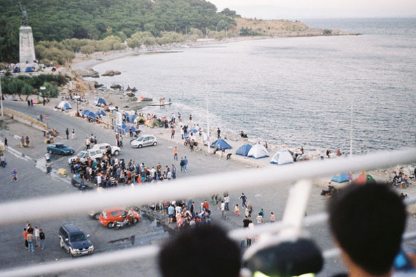 Acht Kilometer steinige Küste, ruhige Brandung, Schwimmwesten und kaputte Gummiboote zu Haufen zusammengetragen. Die Sonne scheint. Katerina und ich machen mit dem Motorrad Staubwolken auf der unbefestigten Straße. Eftalou ist wie eine lange Bühne. Die Flüchtenden sind gerade den Bomben, den Terroristen, dem unzumutbaren Leben in Syrien, Afghanistan oder dem Irak entkommen. Hier müssen sie die Schiffbrüchigen spielen, nass aus dem überfüllten Boot steigen, manchmal schlitzen sie es auf den letzten Metern gezielt auf.