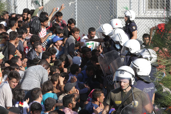 Polizisten mit Schildern und Helmen versuchen die Schlange zur Registrierung zu kontrollieren, indem sie den Menschen befehlen, sich auf den Boden zu setzen. Manche stoßen mit dem Kopf an die Schilder der Polizisten, so eng ist es. Von hinten und von der Seite drängen einige aggressiv nach vorn Richtung Polizeisperre, andere drückt es deswegen gegen den Zaun. Ein Handgemenge zwischen zwei Männern, kein Polizist greift ein. Katerina, ich und viele andere sehen das alles von einem Erdhügel aus, der die Fläche begrenzt.