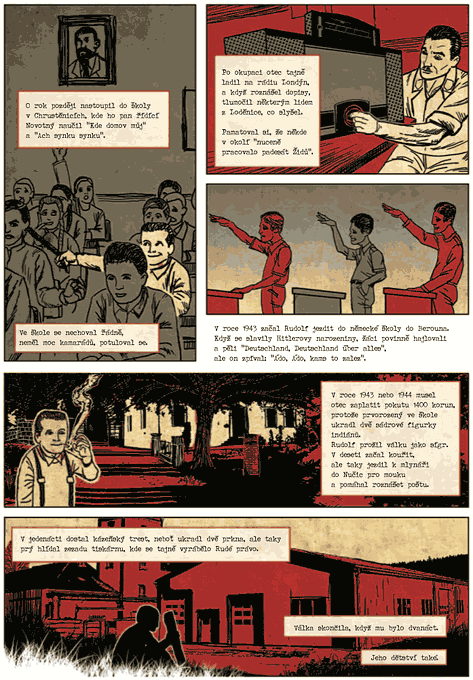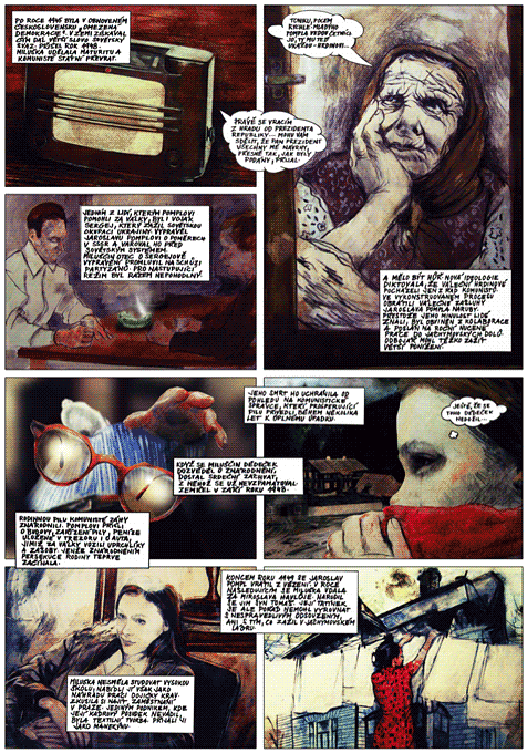 dav. Smutným faktem je, že Bělohoubkovi rodiče mezi kolaboranty vůbec nepatřili. A nepatřil mezi ně ani německý průmyslník Adolf Lange, který ukryl mnoho Čechů před aparátem okupantů. I on byl zabit spolu s Bělohoubkovými rodiči. Důvod? Stal nepohodlným, protože by mohl ukázat na skutečné padouchy.Alespoň vizuální odlehčení přináší komiksová story Leopolda Farbera, přezdívaného Hurvínek. Farber se přidal k protinacistickému odboji a po únorovém puči se nebál ani komunistů. Jeho eskapádám vtiskl kreslíř s pseudonymem Vhrsi rozesmátou, barevnou, jednoduchou, až skoro pohádkovou vizuální podobu, která lehce připomíná komiks Čtyřlístek od Jaroslava Němečka. Vizuální stránka ale ostře kontrastuje s tím, co se v komiksových políčkách odehrává a co si postavy říkají. Právě Farber se ve svém příběhu pozastavuje nad krutostí lidí, kteří slouží režimu – jako kdyby v nich režim probudil nelidskou stránku a spustil zrůdnou rozkoš z trýznění druhých.