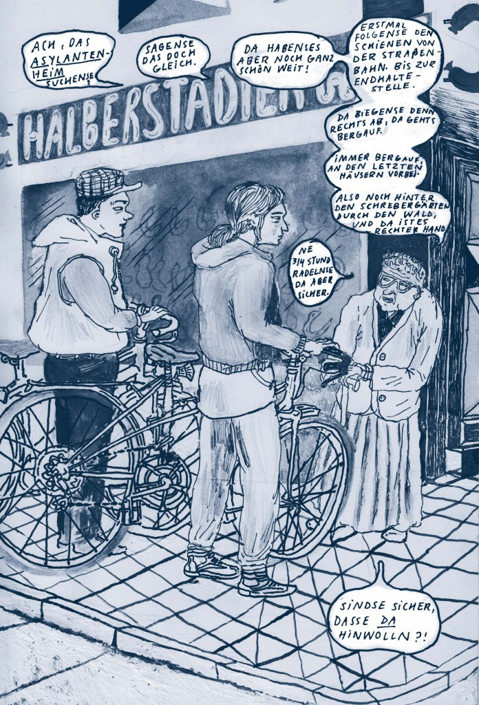 Nach meinen Recherchen habe ich angefangen, daran zu arbeiten und bin gleichzeitig auch „no lager halle“ beigetreten, einer Gruppe, die Kontakte in Flüchtlingsheime aufbaut und hält, Kampagnen organisiert und vieles mehr. Künstlerisch war ich auf der Suche nach der richtigen Form, um die komplexen Zusammenhänge beschreiben zu können. Anfangs habe ich einfach Erlebnisse gezeichnet, über die ich noch weiter nachdenken wollte. Und als ich gemerkt habe, dass aus diesen Fragmenten etwas entsteht, habe ich begonnen, mich konkreter mit Aufbau und Inhalt eines Buches zu beschäftigen.