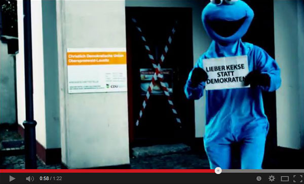 Ale zpět ke Keksíkovi. „Radši sušenky než demokraty“ se jmenuje jedno krátké video. Postavička z dětského seriálu Sezamová ulice v něm uzavírá a páskou zapečeťuje kancelář CDU, protože demokratický systém považuje za překonaný. Tematizován je i bezpečnostní program americké Národní bezpečnostní agentury PRISM. S heslem „Yes We Scan!“ Hlasy budoucnosti vyzývají k odporu proti státu, který nás špehuje: „Dnes jsou to už i němečtí demokraté, kteří hrají na stejnou notu jako špehující fanatici ze země za velkou louží (…) Hlasy budoucnosti v takovém proskleném světě, ve kterém je nahráván a kontrolován každý náš krok on- i offline dobrovolně žít nechtějí.“ Je to skutečně nebezpečný fenomén nebo jen internetová hříčka s krátkou dobou životnosti?