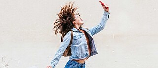 Eine junge Frau macht einen Freudensprung vor einer hellen Häuserwand. Sie trägt einen Rucksack und hält ein Smartphone in der Hand, sie macht gerade ein Selfie. © Goethe-Institut, Getty Images © Goethe-Institut, Getty Images