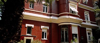 Grünes Eingangstor vor einem sandfarbenem Gebäude, der Modern English School Cairo الصورة (جزء): معهد جوته / Sandra Wolf الصورة (جزء): معهد جوته / Sandra Wolf