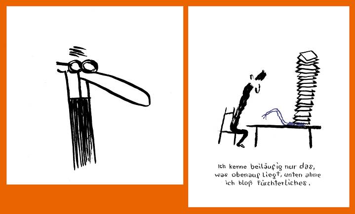 Schon früher ist bei Besprechungen meiner Bücher immer wieder einmal der Vergleich mit den Zeichnungen Kafkas gefallen. Ich habe das eigentlich nicht hinterfragt, obwohl mir die Zeichnungen von Kafka von den Buchumschlägen bekannt waren. Seine Zeichnungen fand ich immer sehr gut, sehr einfach und prägnant. Natürlich kann man Ähnlichkeiten sehen, weil es Strichfiguren ohne Mimik sind. Bei der Arbeit an der Kafka-Biografie sind mir die Ähnlichkeiten erst richtig bewusst geworden, und es war eine große Freude, damit zu spielen.