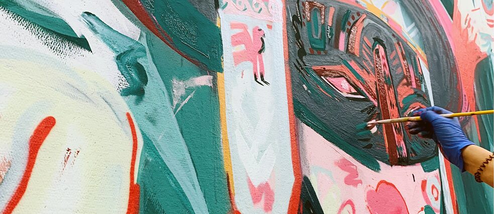 Aus ihrer Teilnahme an Concéntrico in Logroño und dem Projekt Sintonía ist die Zusammenarbeit für dieses Wandbild enstanden, das mit verschiedenen Perspektiven und Raumillusionen spielt.