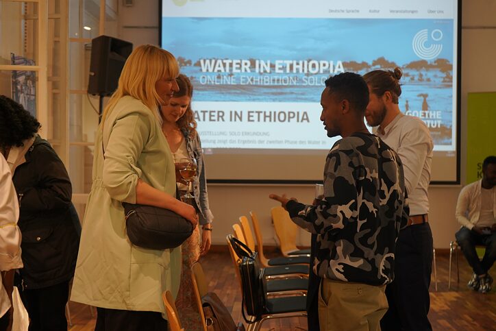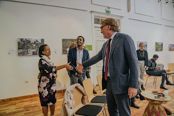 Im Anschluss an ihre Treffen mit lokalen, staatlichen und nichtstaatlichen Akteuren, die im Bereich der humanitären Hilfe tätig sind, veranstaltete das Goethe-Institut Äthiopien am Dienstag, den 11. April 2022, einen Abendempfang für Luise Amtsberg, an dem Kulturschaffende und Vertreter*innen von Kreativunternehmen und aus der Zivilgesellschaft teilnahmen. Im Rahmen des Gesamtprogramms präsentierten verschiedene äthiopische Künstler*innen ihre Projekte, Motivationen und Ideen im Kontext der relevanten gesellschaftlichen Themen, die sie mit ihren Arbeiten anzusprechen versuchen. Auch die sieben teilnehmenden Fotograf*innen des Goethe-Institut-Projekts "Water in Ethiopia", das Lusie Amtsberg bereits kannte, stellten ihre Arbeiten aus dem Jahr 2022 vor und gaben einen Ausblick auf ihre gerade in Bahir Dar für eine Ausstellung entwickelten Fotostorys.
