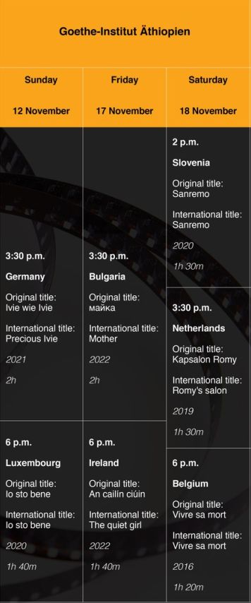 Das Goethe-Institut Äthiopien freut sich, Gastgeber für die Vorführung von sieben bemerkenswerten europäischen Filmen aus Deutschland, Luxemburg, Bulgarien, Irland, Slowenien, den Niederlanden und Belgien zu sein.