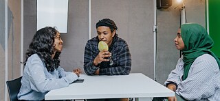 Our multimedia studio offers a working space for professionals by providing modern equipment like a green screen, a projection screen, a projector, lights, loudspeakers, a camera as well as a laptop with essential programs.