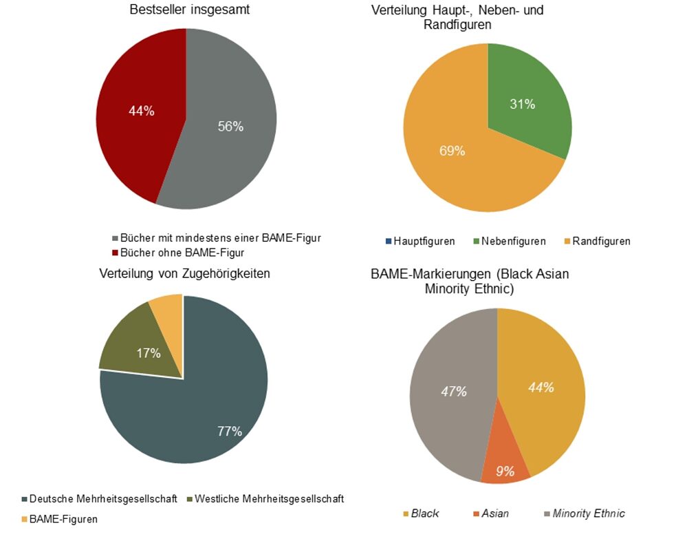 Insgesamt zeigt sich für die Präsenz von BAME-Figuren sowie für eine differenziertere Darstellung derselben ein positiver Trend in den Kinderbuch-Bestsellern. Eine Reduktion der BAME-Figuren auf Problemfälle, die Kinderbüchern oft attestiert wird, kommt in den untersuchten Büchern nicht zum Vorschein. Themen, die in Kinderbüchern im Hinblick auf BAME-Charaktere häufig behandelt werden, wie Abschiebung oder Diskriminierungen, sind in keinem der untersuchten Bücher Teil der Geschichte. Auch die beobachtete Tendenz, dass um Toleranz für die entsprechenden Figuren geworben wird, kann für die untersuchten Büchern nicht bestätigt werden. Ebenso wenig wie eine Exotisierung oder Kulturalisierung der BAME-Figuren. Das bedeutet jedoch nicht, dass die untersuchten Kinderbücher positive oder realistische Bilder einer Migrationsgesellschaft entwerfen.Im Gegenteil, die Autor*innen in den untersuchten Büchern verzichten auf jegliche Form von kulturellen Bezügen und vermeiden die Benennung von Unterschieden. Die BAME-Figuren erscheinen zum Großteil als gut angepasst; ihre Migrationsgeschichte, ihr Herkunftsland und dessen Kultur scheint für sie ebenso wenig eine Bedeutung zu haben wie daran anknüpfende Erfahrungen oder Eindrücke. Lediglich eine Figur bezeichnet sich als dem Herkunftsland ihrer Mutter zugehörig und sieht Vorteile in dieser Mehrfachzugehörigkeit. Diese Darstellung der BAME-Figuren suggeriert, dass Zusammenleben nur funktioniert, wenn alle gleich sind, bzw. wenn sich die Minderheiten der Mehrheit anpassen. Anstatt es den Kindern zu erleichtern, sich mit Vielfalt und Unterschieden wohlzufühlen, können die untersuchten Bücher einen eurozentristischen Blick auf die Welt und „die Anderen“ stärken. Die Notwendigkeit einer vielfältigen Gestaltung von BAME-Figuren in Kinderbüchern wird dadurch besonders deutlich.