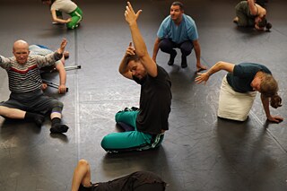 Die gemeinsamen Arbeitseinheiten in den Bereichen Tanz und Improvisationstheater wurden von den Künstler*innen selbst angeleitet. Dabei wurden alle sprachlichen Barrieren mit Hilfe von Übersetzung, Humor und noch mehr mit Mimik und Gestik aus dem Weg geräumt. Im Zentrum der Begegnung stand die Frage der Vermittlung, also die Frage danach, wie Künstler*innen mit und ohne Behinderung ihre Praxis autonom mit anderen teilen können. Im geschützten Raum konnten sich die Künstler*innen ausprobieren und den Mitglieder*innen der Partner-Kompanie ihre Arbeitsweise präsentieren.