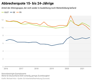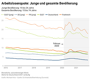 Der Beginn der Coronapandemie hatte in beiden Ländern völlig unterschiedliche Auswirkungen. So ging der Anteil der Arbeitslosen unter den 15- bis 24-Jährigen in Frankreich im Frühjahr und Sommer 2020 deutlich nach oben, sank im Anschluss aber wieder ab.